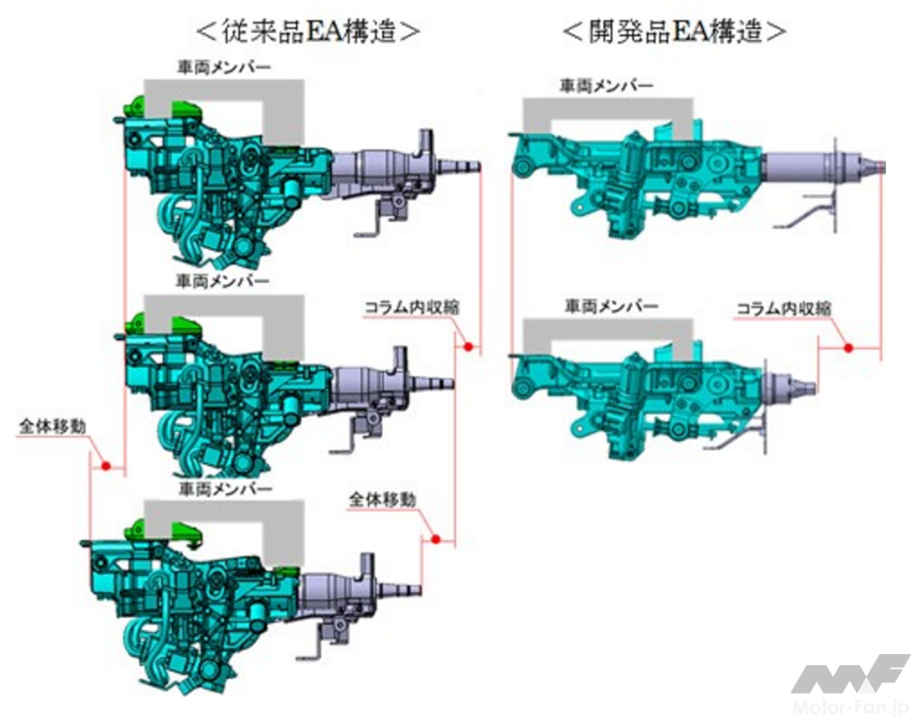 ステアリングコラム(以下「コラム」)には、事故の際にドライバーへの衝撃を吸収し、傷害を軽減させるための衝撃エネルギー吸収構造(EA構造)をもたせている。従来、コラム全体を車両前方に移動させることと、コラムの収縮可能な2体チューブ部分を収縮させることで適応していたEA構造を、今回の開発品ではコラム収縮のみで完結することに成功。それにより、部品点数を削減でき、コラム全体の質量は従来品比30%低減を達成した。また、アルミ部品の肉厚を薄くすることと、シャフトの中空化による部品形状の最適化で、高剛性と軽量化が両立された。
