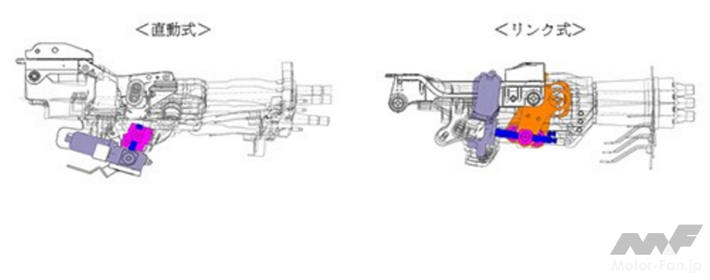 ハンドルを上下方向に動かすためのチルト構造を、従来の、コラム下側にモータを配置した直動式から、リンク式に変更。従来品の直動式では、モータ回転させたスクリューでナットを上下に動かすことでハンドルを上下方向に動かす。ナットの上下にスクリューを配置し、スクリューの下にモータを配置するため、コラム下側スペースに部品が積み上がる構造となっていた。一方、今回、リンク式のチルト構造を採用したことでコラム直下にナットを配置する必要が無くなった。これにより、直動式と比較してコラム下方寸法(高さ)を30%低減でき、省スペース化が達成された。そして、コラム下側スペースを確保することで二次衝突時における膝の安全性向上に貢献している。