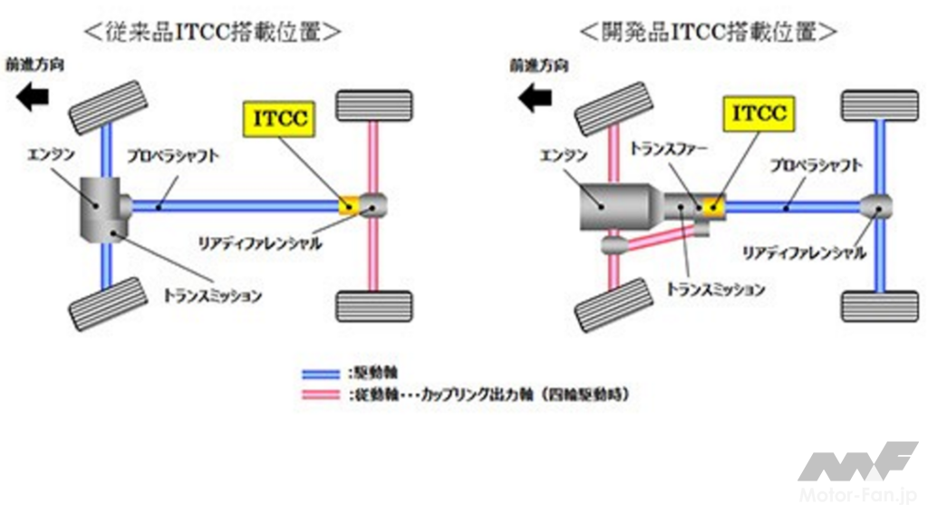 従来のFFベース車両への搭載を前提としたITCC構造から、トランスミッション・リアプロペラシャフト間を直結する貫通シャフト構造を採用したことでFRベース車両へのITCC搭載を可能にさせると同時に、トランスファー内レイアウトに合わせた小径化により、省スペース化と従来比約10%の軽量化を実現。これにより燃費効率向上にも貢献。