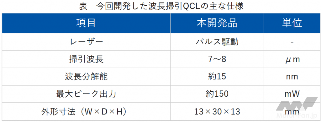 産総研のセンシングシステム研究センターが開発した駆動システムと組み合わせることにより、波長掃引QCLの高速な波長掃引を実現できる。20ミリ秒以下で中赤外光の連続スペクトルを取得することができる。これにより、時間的に高速に変化する現象を分析することが可能となる。