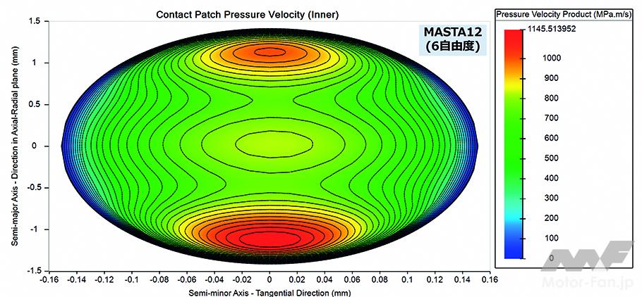 MASTA12ではモータの高速回転化のカギとなるボールベアリングの解析機能も強化された。これまでの解析ではボールは2つの自由度しかもたなかったが、6自由度の準静的な解析が可能となり、ボール接触部の滑り速度をより正確に解くことができる。これによって軌道の表面損傷やフリクションロスの予測など高速化の課題解決に有効な指標を与える。