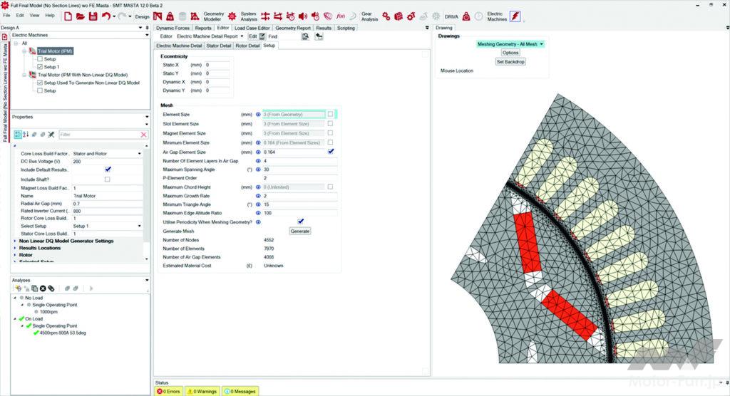 これまでのMASTAではギヤにかかる物理的な力を解くことで、ギヤやシャフトの変形や、それにともなう伝達の効率、振動などの振る舞いを解析してきたのだが、最新バージョンの12ではここに電磁界解析の機能が新たに加わっている。モーターのCADデータが作成できるようになり、力学的な解析ができるだけでなく、それを電磁気という要素と連成させた解析が可能になったのである。当然ながらモデルにはこの電磁界解析を前提としたメッシュも含まれる。