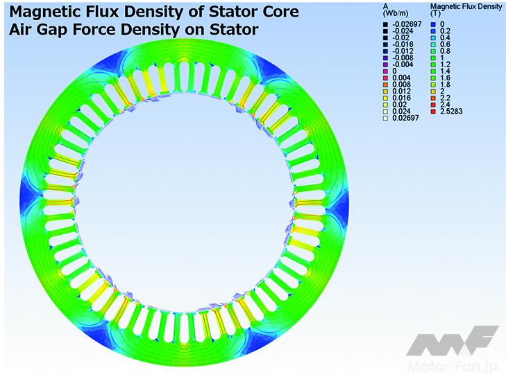 ローター、ステーター部分の色分けは磁束密度の分布を、等高線のような線は磁路を表す。エアギャップ付近に並ぶ矢印群は、ステーター表面からローター表面へと働く磁力(磁気吸引力)の大きさと方向。モーターの音振に大きく影響する要素だ。