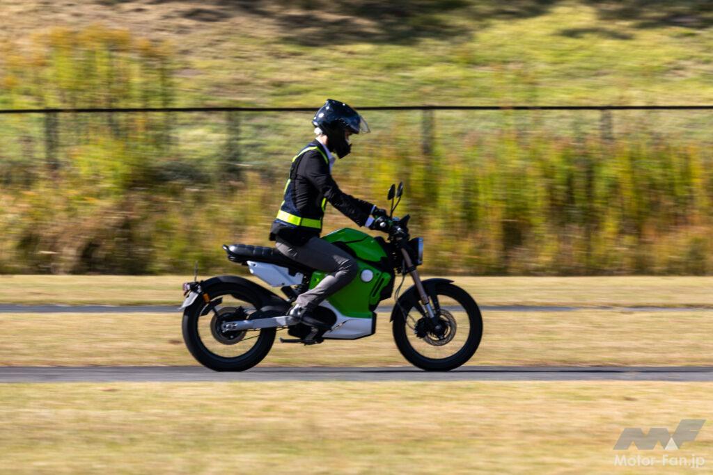 試乗はカートコースで開催、タイトなターンを繰り返すコース設定。概してバイクのエンジンというものは回転上昇に伴って出力が高まっていくと理解していて、しかし駆動機がモーターとなると回転し始めから最大トルクが発揮されることとなり、非常に神経質な特性になってしまっているのでは——とかなり警戒していた。まして本試作車は出力が増強されている仕様。さらに「走行モードが3つありまして、3がいちばん強力。このコースだと速すぎて使えないかもしれません」などと走る前から追い討ちをかけられ、すっかり縮こまっているスタートとなっていた。