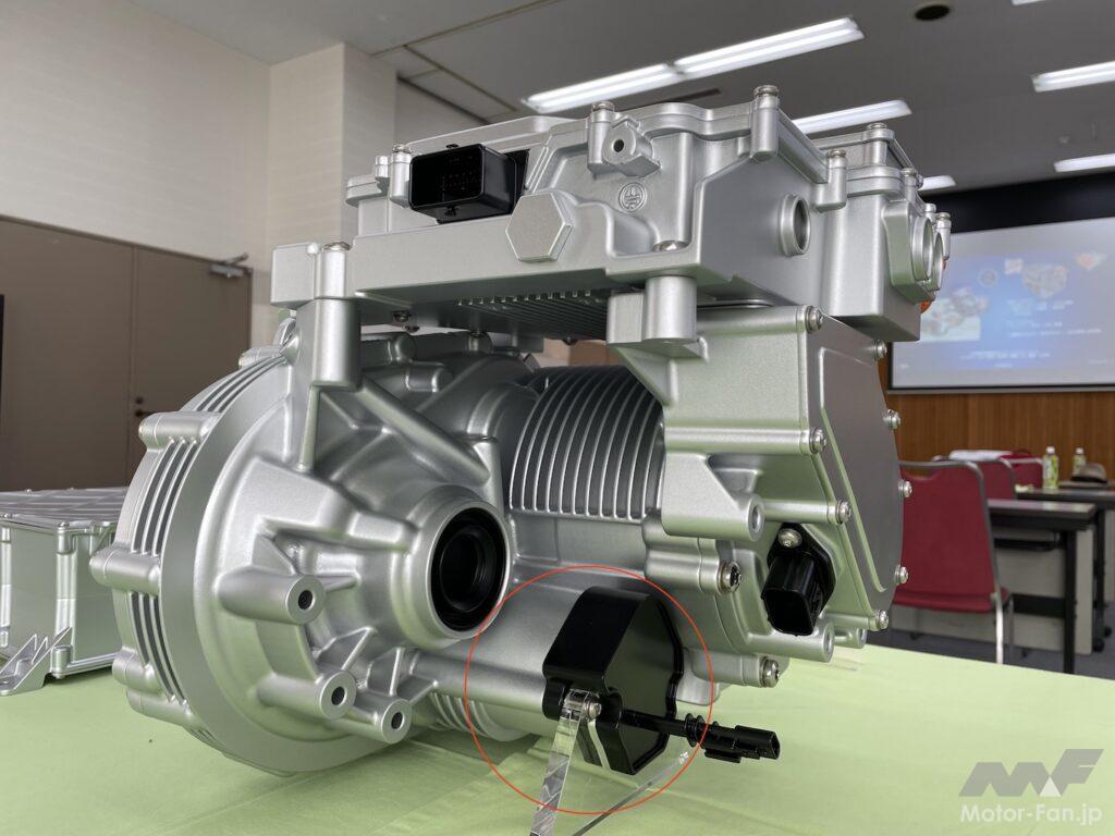 丸で囲んだ部分が電動オイルポンプ。フルードはギヤオイルのみでまかなうというから驚いた。低粘度で引きずり抵抗は極限まで抑え、しかしデフギヤにおける極圧性能も両立しているという。
