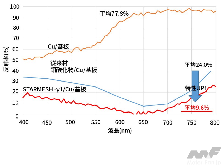 本製品を用いてスパッタリング法で成膜した黒化膜は、銅の導電膜の可視光平均反射率を従来材24.0%から9.6%まで低減させることができる。また、この黒化膜は車載向け電子部品環境試験(温度85℃、湿度85%、1000時間)で色が変化*4することがなく、厳しい環境での使用や適用製品の長寿命化が期待されている。
