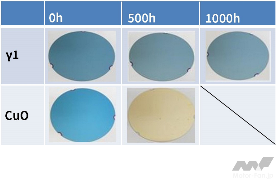 そこでITOに代わり、導電性および柔軟性に優れるメタルメッシュの普及が進んでいる。メタルメッシュに主に用いられる銅の導電膜は金属光沢があり、外光を反射するためタッチパネルの視認性が悪化してしまう。そのため銅の上に黒化膜を重ねて反射を抑制する必要があり(図2)、従来は銅酸化物が黒化膜として用いられてきた。さらに電子黒板などの大型表示装置や、大画面化が進む車載用タッチパネルは、買い替え期間や耐用年数が長いため、より高い耐久性が要求される。しかしながら、従来の銅酸化物の黒化膜は長期間過酷な環境にさらされると変色し、タッチパネルの視認性が悪化する課題が残っていた(図3)。そのため、より変色耐性の高い黒化膜が求められている。