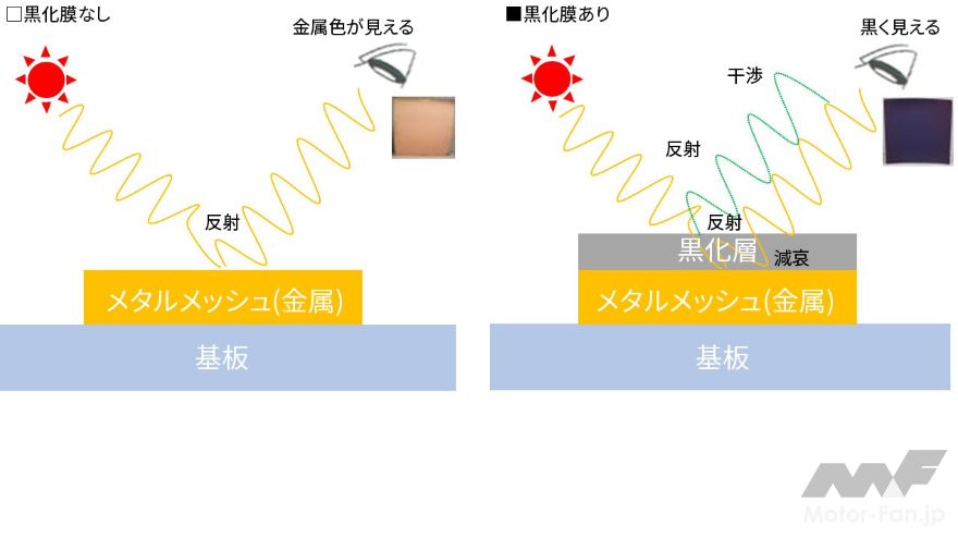 ②高変色耐性:黒化膜は環境試験後(温度85℃、湿度85%、1000時間)も変色なし。