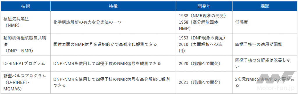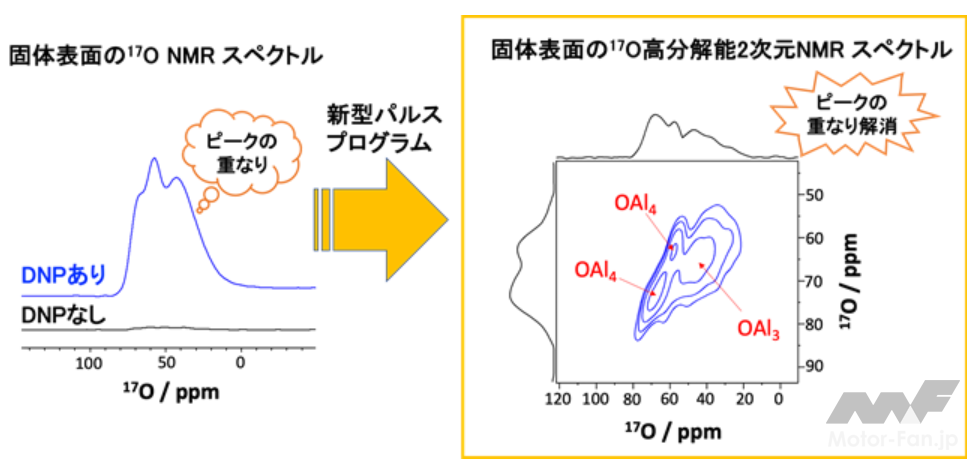 そして今回NEDOと産総研、ADMATは、四極子核の高分解能化手法であるMQMAS(Multiple Quantum Magic Angle Spinning)※5をD-RINEPTに組み込んだ新型パルスプログラム(D-RINEPT-MQMAS)を開発した。これにより、固体表面の酸素原子核をはじめとする四極子核のNMRスペクトルを高速かつ高分解能で観測でき、より高精度に触媒表面の構造解析ができるため、革新的な材料開発の促進に寄与する。