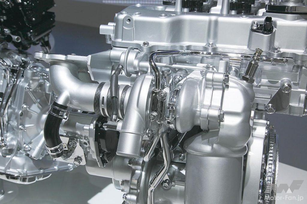 排気マニフォールドとタービンハウジングを一体化したターボユニットを装着。ターボは、「EGRを強引に入れてやる」(開発担当者)ためのデバイスでもある。その下にタービン直下型触媒。最新ガソリンターボエンジンのトレンドを網羅していた。