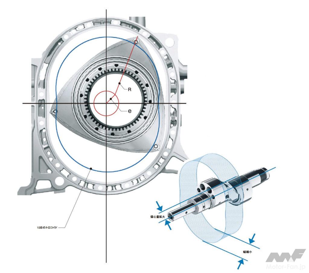 e値とはeccentricity=偏心量 エキセントリックシャフト軸中心とローター中心間の距離、R値は創成半径でローター中心とアペックス頂点間の距離のことだ。
