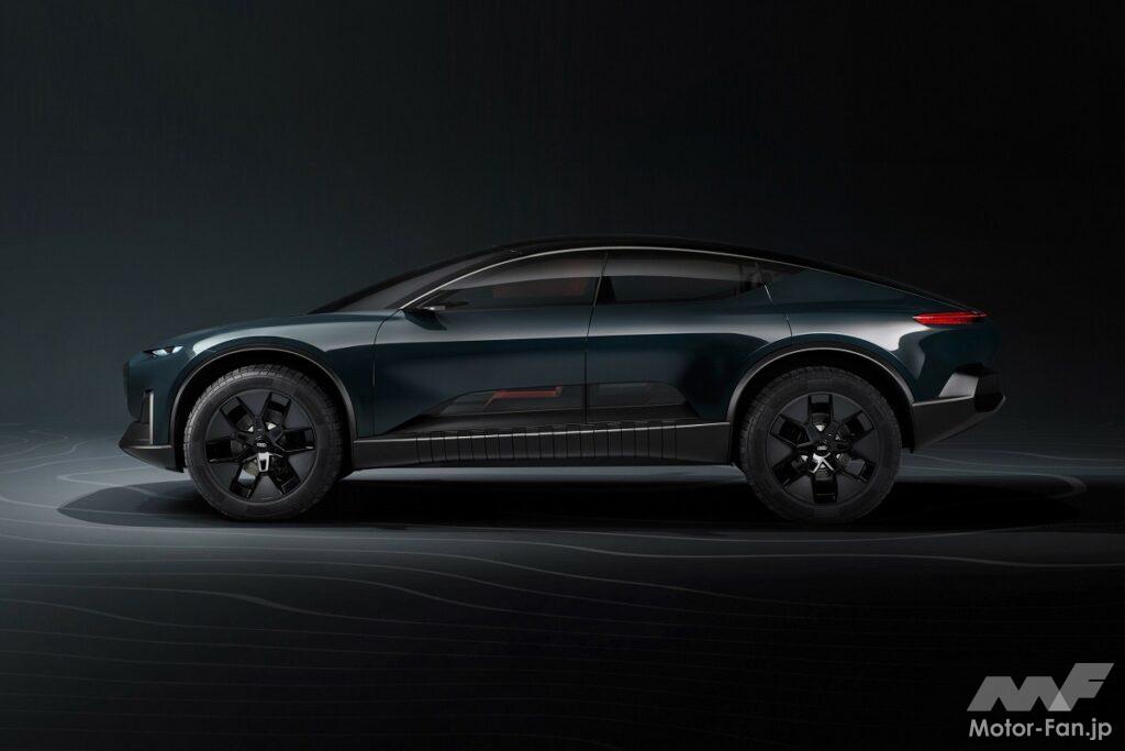 アクティブスフィア・コンセプトのボディサイズは、4.98m×2.07m×1.60m(全長×全幅×全高)、電気自動車らしくホイールベースは2.97mと大きく、後席足元には広いスペースが確保されている。非常にエレガントなこのクルマは、単なるラグジュアリースポーツカーではなく、印象的な最低地上高とオフロードにおける優れた走破性を実現する22インチの大径ホイールを備えている。スポーツバックとしてデザインされたアクティブスフィアのリアは、決して小さくないボディだが、前後オーバーハングが短いことで数値以上にコンパクトに見える。さらに、ボディ・ボンネット・ウィンドウがシームレスに繋がっているためか、1つの塊から削りだしたような収まりの良さを感じさせる。足回りには、22インチの大径ホイールに、オフロードにも対応するトレッドパターンを備えた 285/55タイヤを装着している。さらには驚くなかれ、ホイールには走行環境に合わせて開閉するシステムが組み込まれている。オンロード走行時には空気抵抗を最適化するためにホイールは閉じ、オフロード走行時には冷却性能を高めるためにホイールが開くようになっている。