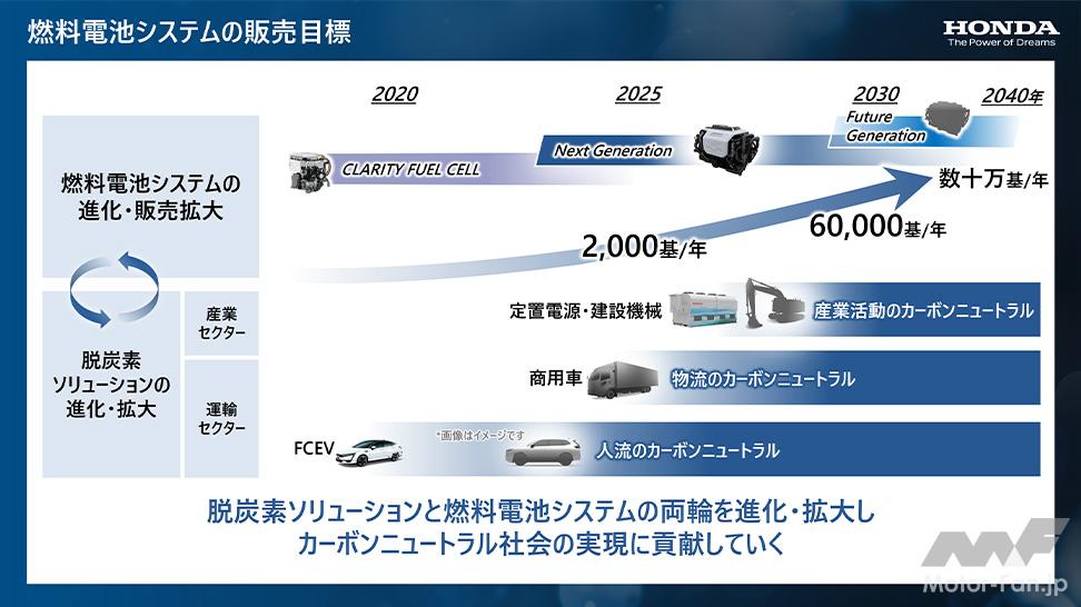 世の中の環境動向を踏まえ、コア技術である燃料電池技術の適用先を自社のFCEV以外にも拡大していくことで、カーボンニュートラル社会に貢献するため、2020年代半ばに次世代燃料電池システムのモジュールの外販を開始。販売当初は年間2,000基レベルを想定し、段階的に拡大することで、2030年に年間6万基、2030年代後半に年間数十万基レベルの販売を目指す。
