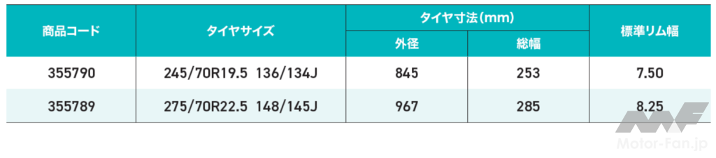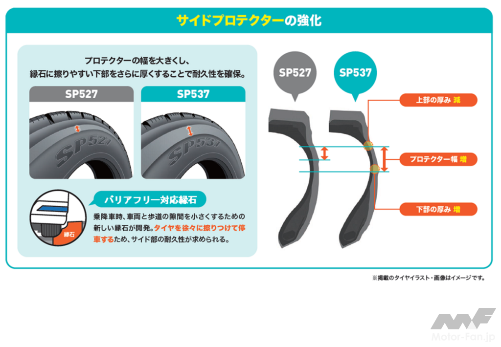 「SP537」は、車両の加減速やロータリーでの旋回、停留所への幅寄せなど、路線バス特有の荷重変動で発生する偏摩耗を抑制したロングライフタイヤだ。また、バリアフリー対応縁石へのタイヤ接触を考慮した新形状サイドプロテクターが採用されている。