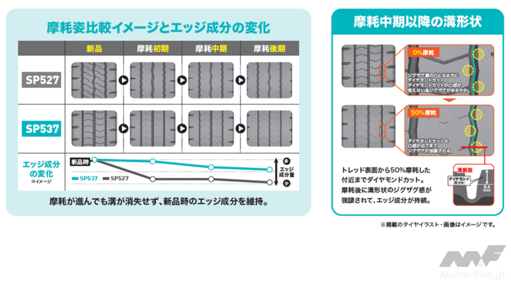 従来品「SP527」は、摩耗初期でサイプが一部消失し、トレッドパターンの外観変化や水を掻き出すエッジ成分の低下があったことを受けて、「SP537」では深溝サイプを採用することで、同様の現象が抑制されている。また、摩耗後期になるとジグザク溝が強調される溝形状と合わせてウエット性能の持続性が高められた。