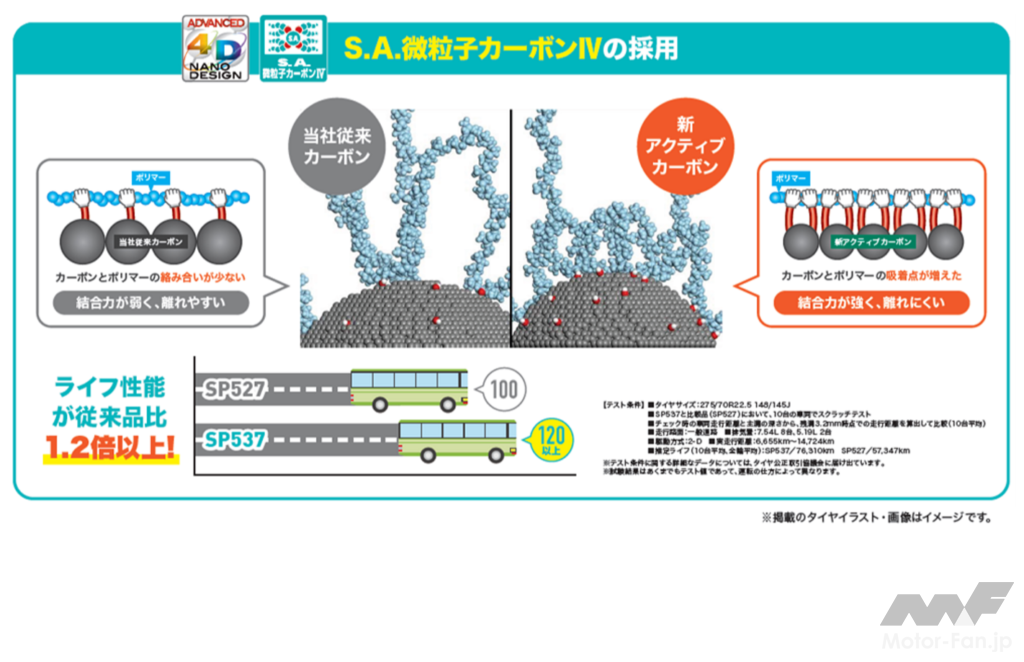 耐偏摩耗性能の向上に加えて、カーボンとポリマーの吸着点を増やした「S.A.微粒子カーボンⅣ」を採用することで、カーボンとポリマーの結合力が強化され、ライフ性能が従来品「SP527」比で1.2倍以上向上されている。