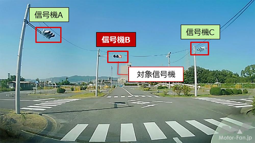 高性能・高速エッジAIにより、運転中の車から遠く離れた小さな信号機を検知することが可能。また、図1のような交差点に直進で差しかかった場合、デンソーテン独自のアルゴリズムで運転中の車から信号機までの距離と方向を算出することで、前方にある信号機Bを従うべき信号機(対象信号機)、左右にある信号機A・Cは対象外と判定する。(特許出願済)