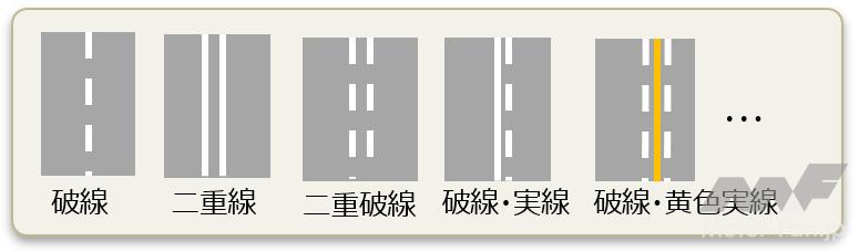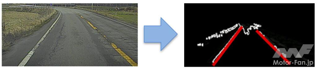 さらに図3のような破線や二重線などの車線を検知し、図4のような車線位置(はみ出してはいけない線)を定め、自車から車線までの距離を正確に検知することで、ふらつきや車線逸脱をより高い精度で判定する。