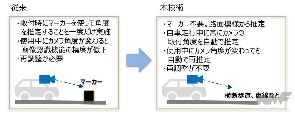 従来はカメラ取付時にマーカーを使用してカメラの角度を手動で設定していましたが、オートキャリブレーション機能が加わることで、走行中にカメラの取付角度を自動で推定し補正する。(特許出願済)