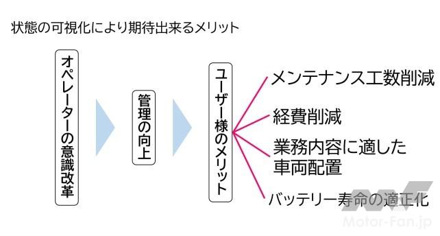 特に、 多くの車両を保有する事業者においては、 電動式フォークリフトの動力であるバッテリーのトラブルが発生すると業務遅滞などの支障が生じてしまう。 しかしながら、 電動式フォークリフト車両数が多くなるほど適切なバッテリー管理に労力がかかり、 また異常の検知が漏れやすくなってしまう。