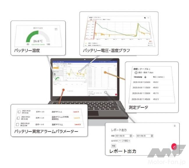 習得したバッテリー情報は、 パソコンやスマートフォンで閲覧することができ、 バッテリー異常時にはメール通知を受けることも可能。 BL-100の場合、 バッテリーの短命化につながる過充電や長時間連続充電、 長期間未充電、 過放電、 液不足などの各種アラートメールを受け取ることができる。 また、 クラウドに蓄積されたデータはレポートとして出力可能。