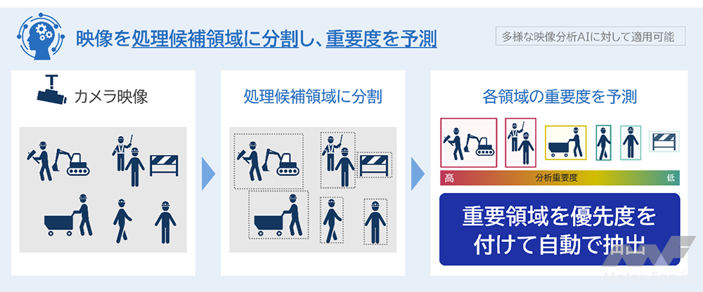 カメラ映像に映った人やモノから、映像分析AIで処理すべき領域 (重要領域) を自動で抽出する。映像内の人やモノ、地面などの背景、それらの境界といった領域単位で映像分析精度への影響を学習することで、処理すべき領域単位で重要度を予測する。この学習は、映像分析AIに入力する映像を変化させた場合の分析結果の変化のみに基づいており、行動認識や物体検出といった映像分析AIの種類、内部処理方法には依存しない。このため多様な映像分析AIに対して適用が可能。