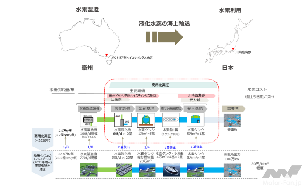 現在、建設および実証運転に向けた技術調査を行っている段階にあるが、今回、出荷地は、水素源として安価で安定供給が見込まれており、エネルギーセキュリティーに資すると考えられる褐炭※3が近傍で得られる豪州ビクトリア州ヘイスティングス地区が有望とされ、受け入れ地は、近隣となる京浜コンビナートにおける水素需要ポテンシャルや港湾確保の観点から川崎臨海部(神奈川県川崎市川崎区)が有望であることが確認されている。