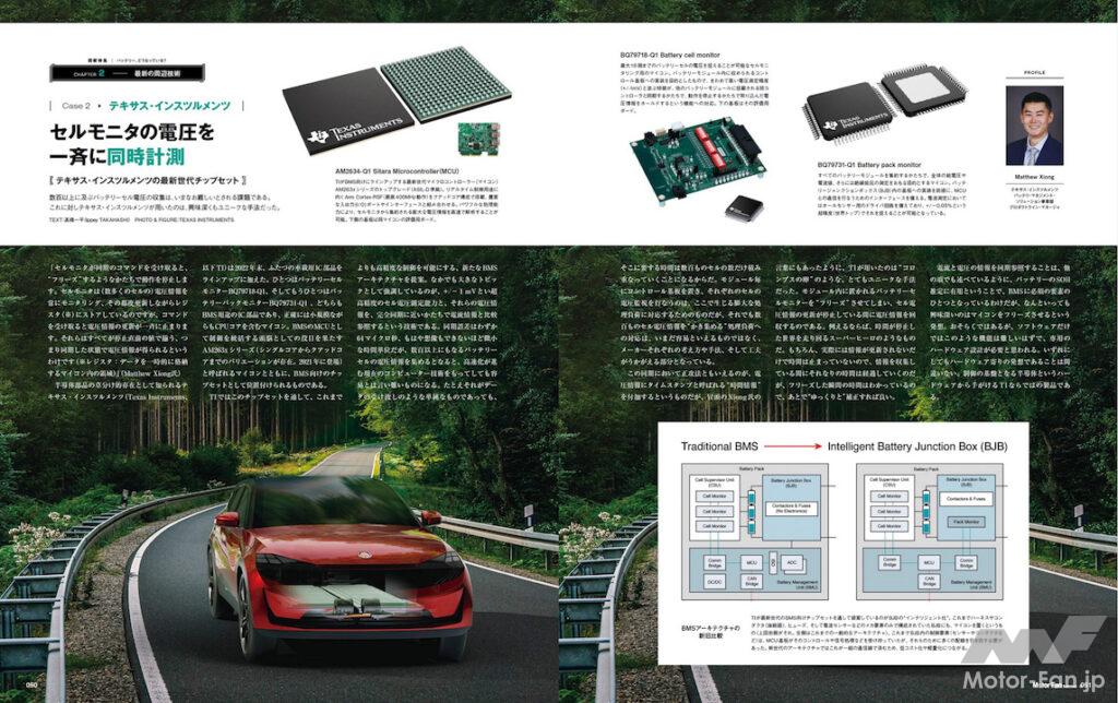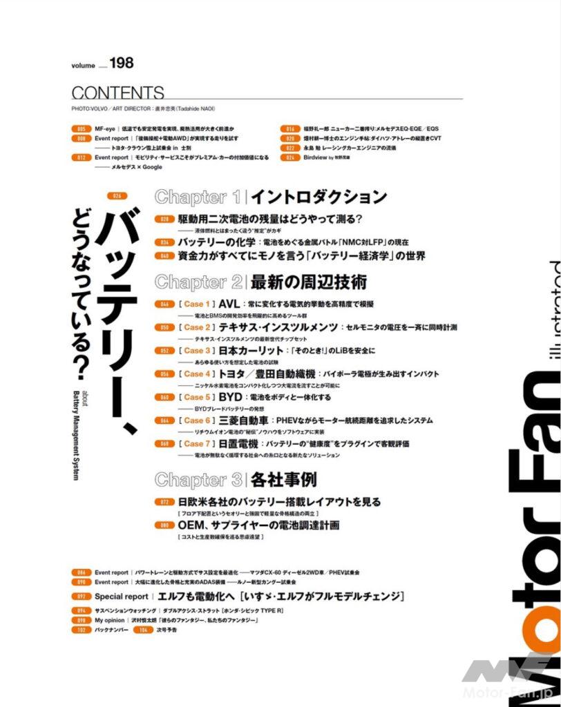 電気自動車:BEVにおけるキーデバイス・バッテリー。いわゆる、エンジン車における燃料タンクの役目を担うのがバッテリーなのですが、ガソリン/軽油と大きく異なるのが「回生によってエネルギー量が回復すること」「容量あたりのエネルギー密度が増え続けている」という点。そして、長く走りたい/速く走りたいというニーズに応えるためにはバッテリーの状態を上手にコントロールする必要がありますが、実はバッテリーパックという機械の正確な残量を把握する術は2023年現在のところまだなく、すべてのBEVは「推定」によってバッテリーを制御しています。その「推定」を担うのがバッテリーマネージメントシステム:BMS。『モーターファン・イラストレーテッド』の198号はこのBMSのテクノロジーを紹介する特集「バッテリー、どうなっている?」を展開してみました。