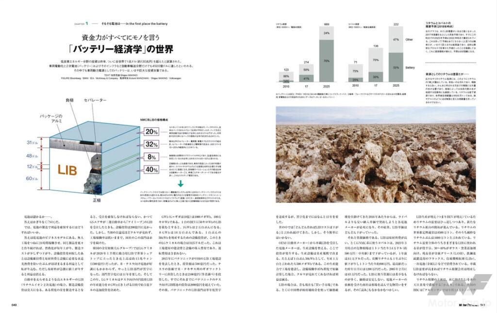 後者の「バッテリーの経済学」は、いわゆる資源争奪戦のストーリーです。レアメタルとまではいかないものの、調達量には限りのあるバッテリーにとっての有効資源については、電動化を推進したい思惑が各国/各社に調達を急がせ急騰する状況。これらと距離を置くLFPはBEVにとっての普及解決策となるのか。各種を考察しました。