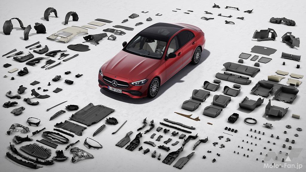 約25kWhの使用可能エネルギー容量と95kWの電気出力を備えるC 300 eのバッテリーによってもたらされる電気走行距離の増加により、燃焼エンジンを使用しないオールエレクトリックモードで最大116kmの航続距離を確保。総重量90.4kgの210個の部品は、資源の消費を抑える素材(再生プラスチックや再生可能な原材料)が一部使用されている。