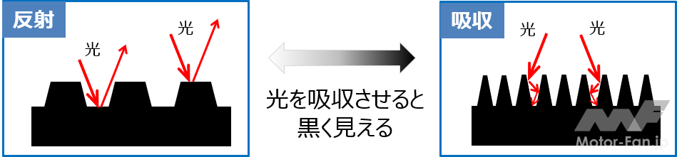 「Nano Black」で新たに採用された凹凸形状は、光が吸収面に衝突する回数が多いほど色が黒く見えることに着目し、吸収面の単位面積当たり表面積を最大化する設計になっている。これにより、どの角度から見てもロゴなどの黒さが損なわれず、くっきり見えるように工夫している。