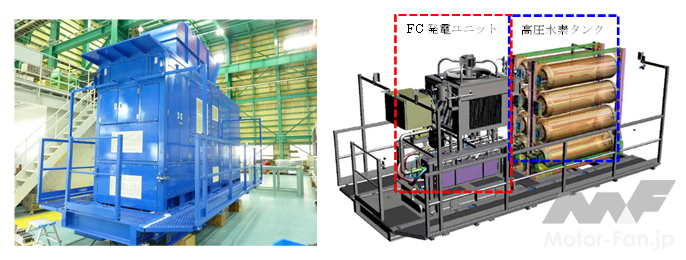 一方、本成果では発電機セットをFC、水素タンク、補機類などで構成されるFCパワーパックに置き換え、蓄電池が大容量化された。FCパワーパックで発電したエネルギーを全て大容量蓄電池に蓄積し、大容量蓄電池から供給される電力のみで荷役する。蓄電池の大容量化により、FCの出力を大きくする必要が無いため小型化が可能であり、また瞬間的な出力にも対応できるため定常運転が可能である。これによりFCの小型化と定常運転化が可能な、世界初のFCパワーパック搭載のRTGCの開発に成功した(図2)。
