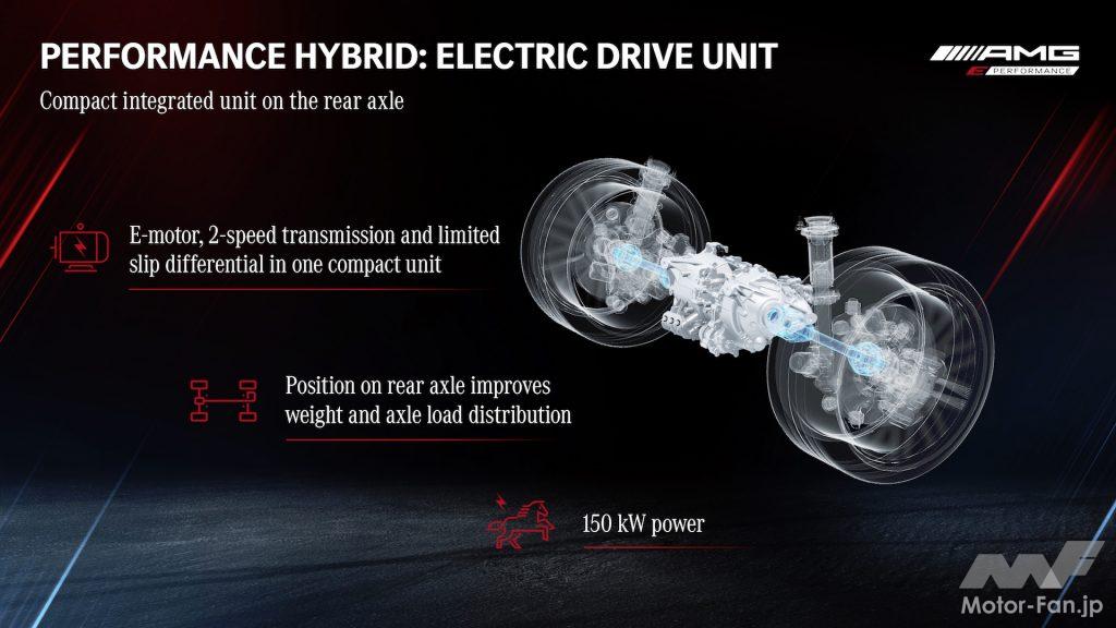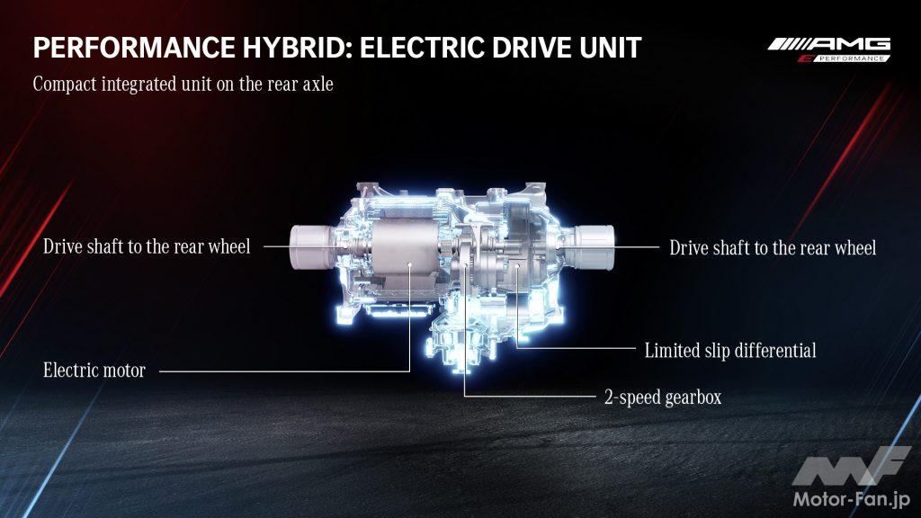 メルセデスAMGブランドとしては初となるハイブリッド車「AMG GT 63 E PERFERMANCE(しかし長い名前だ)」の基本的フォーマットは、高電圧型のモーターを後軸に置き、アシストするというもの。つまり、FR車のリヤデフ内にモーターを収めた機械構造。「GT」自体が後輪駆動車なので、リヤモーターでエンジン+トランスミッションの出力をモーター出力とミックスする=ハイブリッドというわけである。ちなみに本車は4MATIC、つまり前輪も駆動するシステムとしている。