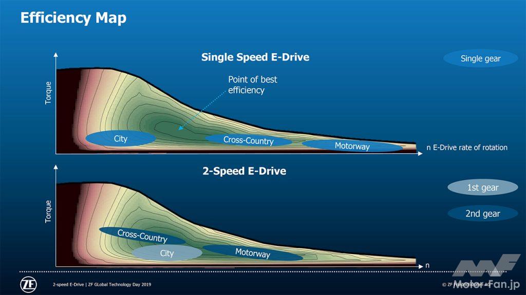 【参考】ZFのモーター駆動2速化を示す資料から。濃い緑で示す「最高効率点」の面積が、2速化によって広く伸びていることが見て取れる。シングルスピード仕様では効率点を外れていた運転領域を、これによりその範囲に収めることができる。