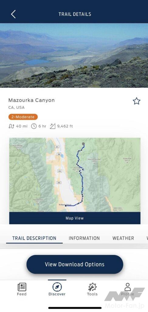 ブロンコSUVのオーナーだけが利用できるこのアプリは、米国、カナダ、メキシコの約1,200の専門家が監修したオフロードトレイルマップを搭載している。また、ウェイポイント、写真、ビデオでドライブを記録し、ソーシャルメディアで冒険を共有することができる。今後のアップデートにより、ブロンコ・トレイルAppにはさらに多くのトレイルと機能が追加されていく。