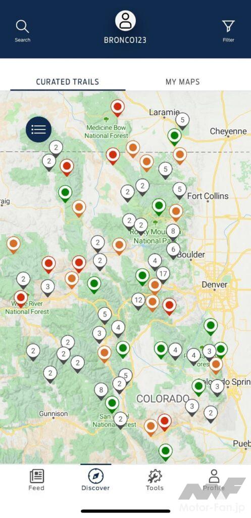 - キュレーションされたトレイルマップ: キュレーションされたトレイルマップ:Bronco Trail Appで常にトレイルを歩き、米国、カナダ、メキシコにある約18,000マイルの既存のトレイルを発見することができる。場所、長さ、難易度などでフィルタリングができる。各トレイルには説明があり、将来の冒険のために保存することも可能。