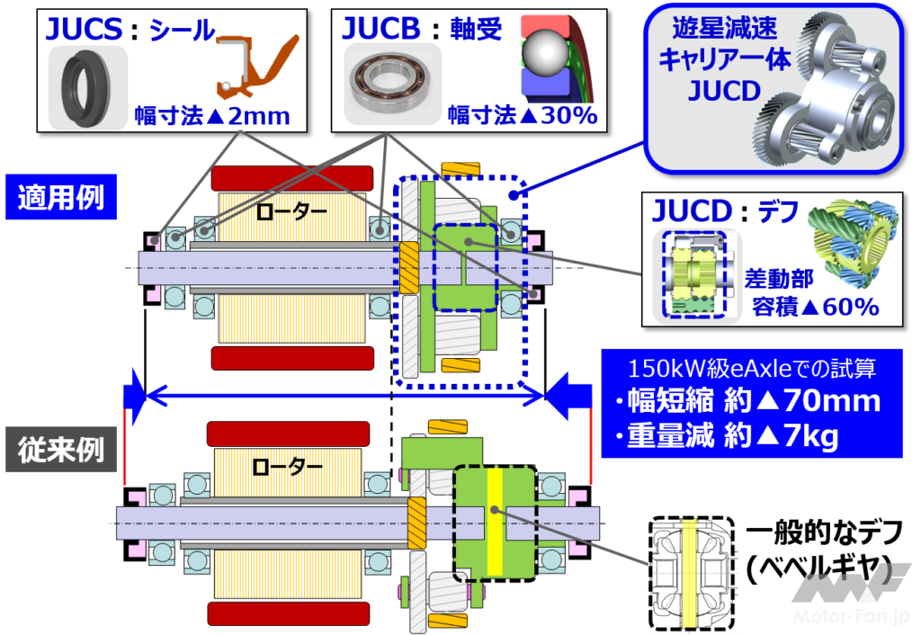 出力150kW級eAxle向けデフ単体としては、JUCDにより約25mmのデフ幅の短縮効果があったが、更に遊星減速キャリアとJUCDを高度に融合させることで、通常デフと組み合わせた遊星減速キャリアに対し約50mmの幅寸法短縮と、全体の小型化・軽量化が実現された。