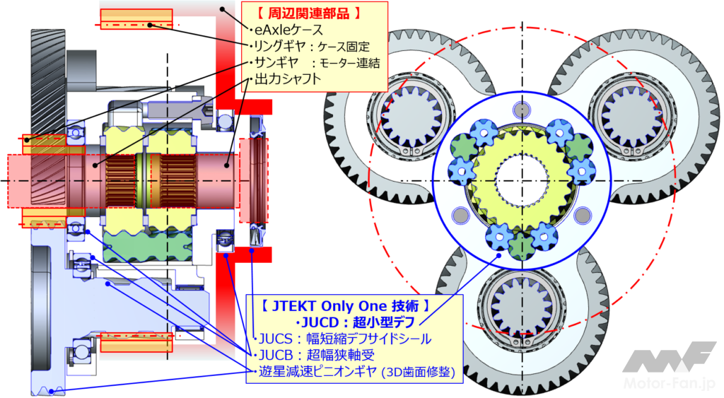 ジェイテクトは2022年8月に、従来のデフを超小型化したJUCDを開発したが、今回ジェイテクトグループが有する技術シナジーを活かして遊星減速キャリア一体JUCDを新開発。同軸遊星式eAxleの更なる小型化・軽量化に貢献することが可能となった。