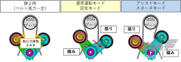 MHEVは走行モードにより、駆動するプーリがクランクプーリまたはBSGプーリに切り替わり、ベルトの緩みと張りが発生する箇所が移動する
