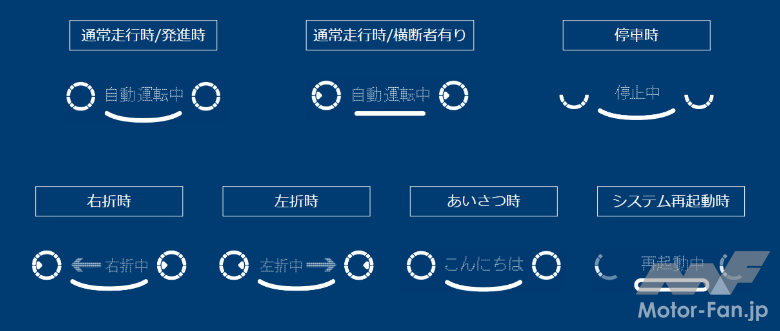 本実証では、境町で定常運行している自動運転バスの1台に市光工業が開発したディスプレーを設置し、車両の状況に合わせて、「発進」「横断者あり」「停車」「右折」「左折」「あいさつ」などを意味するサインを文字や表情で表示する。通常はドライバーがジェスチャーなどで周囲の交通参加者に対してコミュニケーションを行っているが、外向けHMIが車両の状況を分かりやすく伝えることで、その役割の一部を代替する。表示するサインは、車内のスタッフが都度タブレットを使って操作する。市光工業とBOLDLYは、ドライバーの役割の一つである「V to Pコミュニケーション」に着眼している。