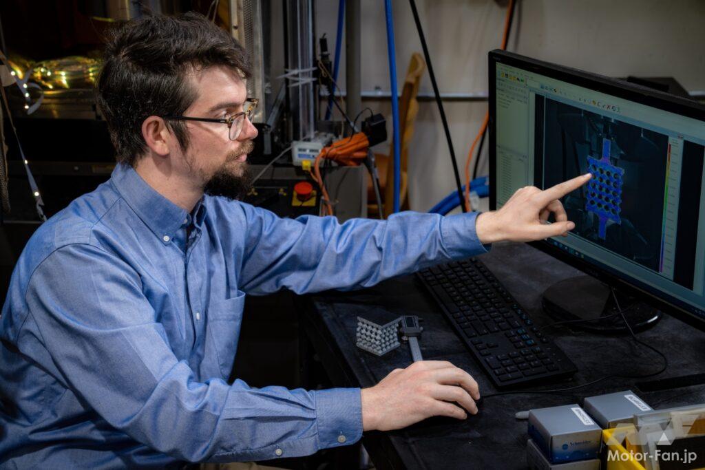 UTの高性能計算クラスタ上で最大数百万のパラメーターを持つディープラーニング・アルゴリズム(人工知能によるもの)を実行することで、研究チームは小さなピラミッドの形をしたモジュール式繰り返し構造を開発した。この構造は液体樹脂から3Dプリントすることができ、自身の68gの30,000倍を保持する。新しく作られたフレームは最大60%軽量化される。ハードコア耐久テストでは、エネルギー吸収において従来のスチールフレームを上回ることが示されており、軽量でありながら超堅牢な代替品として機能する。