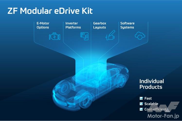 「ZFのモジュラーeDriveキットにより、量産準備が整うまでの開発期間が半減されます。また、電力75〜400kW、トルク350〜540Nmの範囲で構成可能で、かつパフォーマンスや省エネを最大化して設計することができるため、あらゆる車種に使用することができます。たとえば、プレミアムセグメントに100kWドライブと400V対応インバーターを搭載するコンパクトカーやシリコンカーバイド(SiC)をベースにした200kWと800V対応インバーターにも使用でき、コスト効率とテクノロジーの先進性のどちらに重点を置くかに応じて、非常に柔軟に対応することができます。 システム設計、構成、ソフトウェア、電気モーター、冷却装置、および一部部品はクロスプラットフォームを基本に開発されているため、開発の初期段階から相乗効果と高い完成度を得ることができます。 基本のパッケージは、実績のあるZF量産技術に基づいているため、お客様独自の要件に合わせ迅速に補完または調整が可能です」