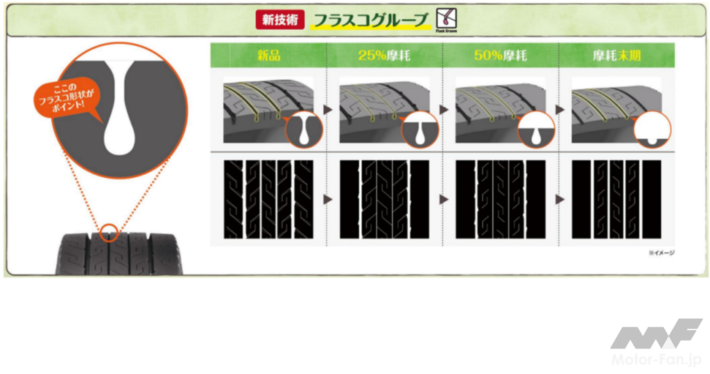 摩耗によって溝幅が広がる丸底フラスコ型の溝形状技術『フラスコグルーブ』を新開発。『フラスコグルーブ』によって溝幅が広がることで、摩耗中盤以降の溝面積が減ることによる排水性能の低下を抑制し、摩耗末期まで優れた排水性能を維持する。