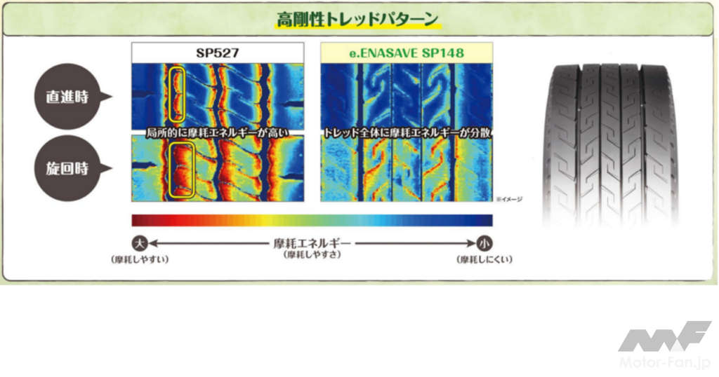 ○摩耗エネルギーを分散させる『高剛性トレッドパターン』