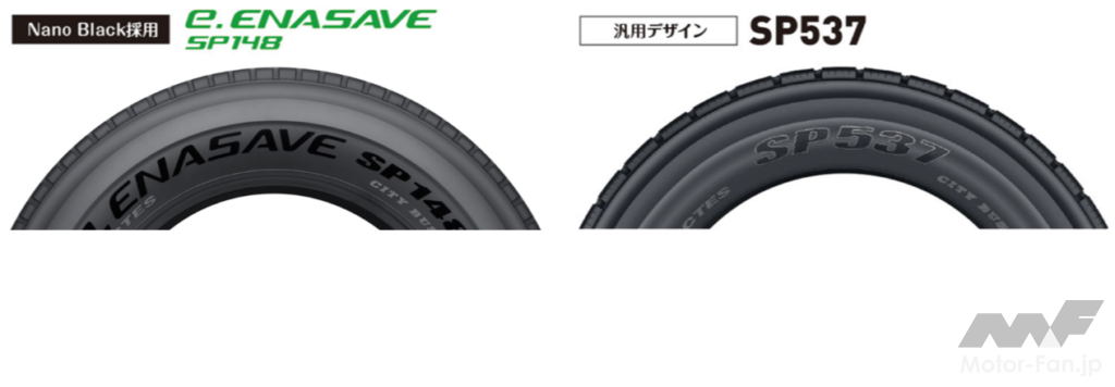 「e. ENASAVE SP148」は、全国でのEVバス導入の加速を受け、EVの課題である一回の充電で走れる航続距離を伸ばすために、転がり抵抗を低減し電費を抑えることを目的に開発された。転がり抵抗を低減するために、タイヤの骨格形状を最適化することで総ゴム量を削減し軽量化された。また、ショルダー部のラグ溝※3を無くし剛性を確保することで、無駄な発熱が抑制された。これらの技術によって、低燃費(電費)性能に寄与する転がり抵抗係数を汎用品DUNLOP「SP537」比25%低減する。
