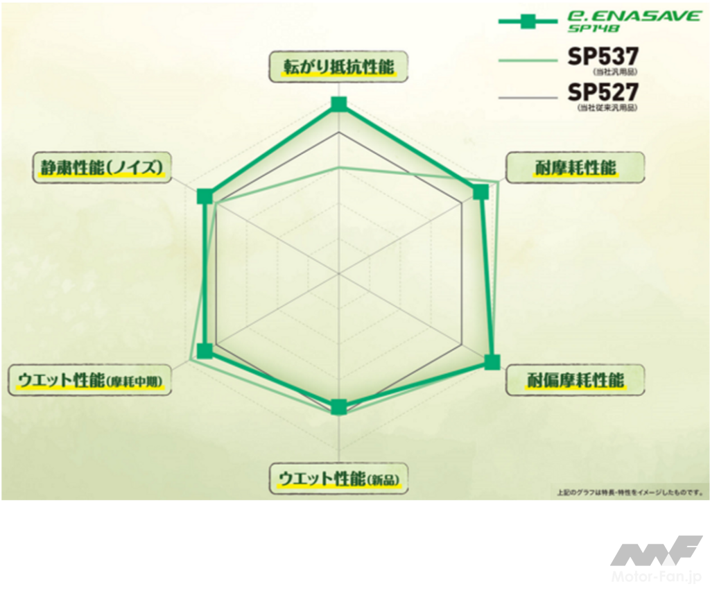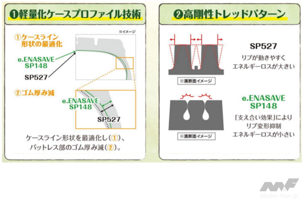 『軽量化ケースプロファイル技術』によって、タイヤの骨格であるケースライン形状を最適化することで余分なゴムをそぎ落とし、軽量化された。さらに、リブ同士が支え合う『高剛性トレッドパターン』を採用することで、リブの動きが抑制され、転がり抵抗に起因するエネルギーロスの低減に大きく貢献する。これらの異なるアプローチを組み合わせることで、転がり抵抗係数を従来汎用品DUNLOP「SP527」比10%低減、汎用品「SP537」比25%低減することに加え、温室効果ガス排出量の削減にも貢献する。