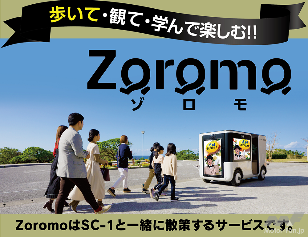 「Zoromo」は、SC-1と共に散策するサービスで、車両の周囲に展開される関連映像や音声を楽しめるものである。SC-1は従来MRで乗員向けに移動中のエンターテインメントが提供されてきたが、「Zoromo」は、車両外部のモニターも移動と連動させることで、乗車していない周囲の人も楽しい移動へと誘う、新しいモビリティサービスへ進化している。