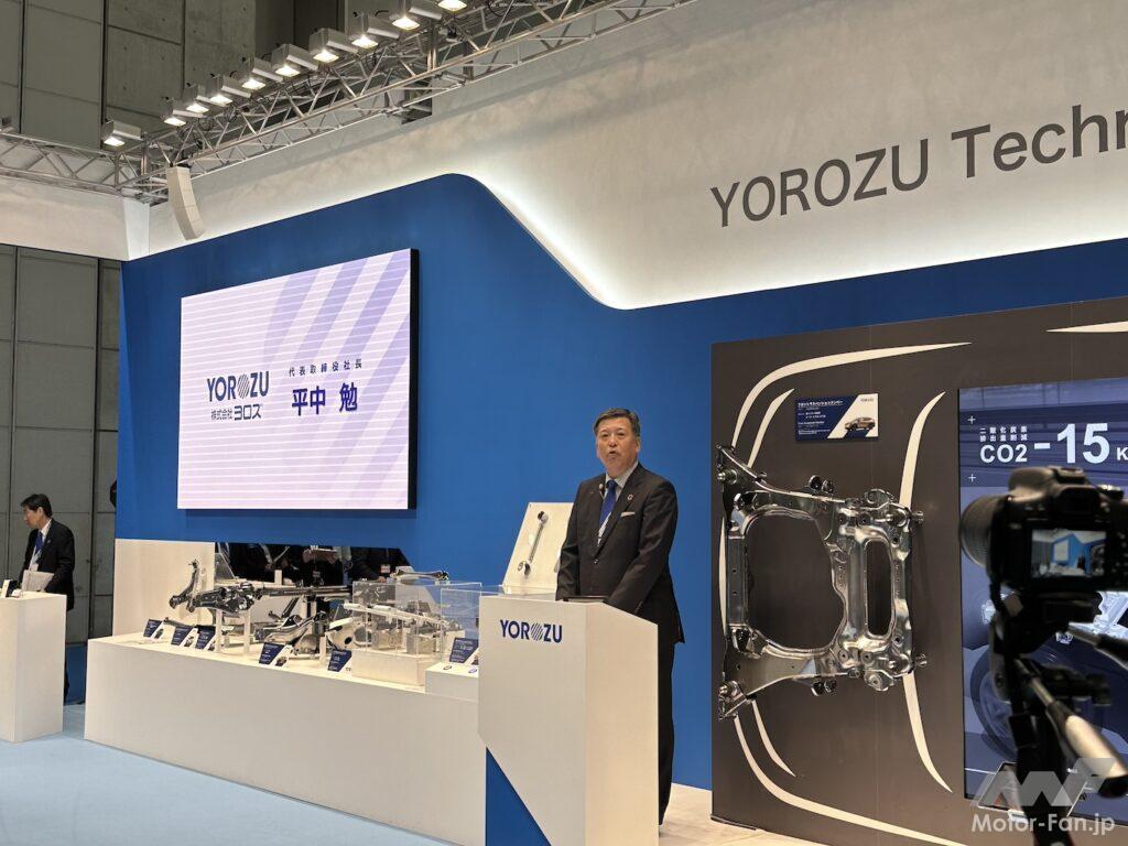 10月26日午前のプレスカンファレンスでプレゼンテーションを行なったのは、平中 勉社長だ。ヨロズが注力するのは、軽量化だ。2020年比で2023年度には30%の軽量化を実現する計画が順調に進んでいるという。また、日本で販売されたBEVの80%にヨロズ製品が採用されているという。