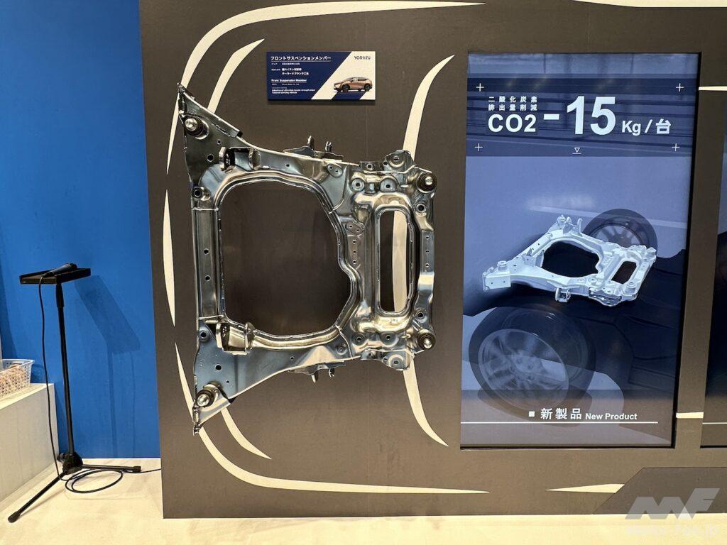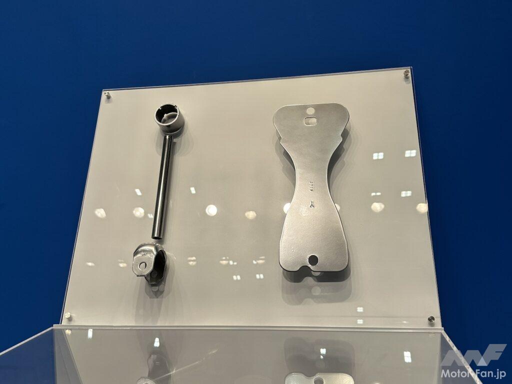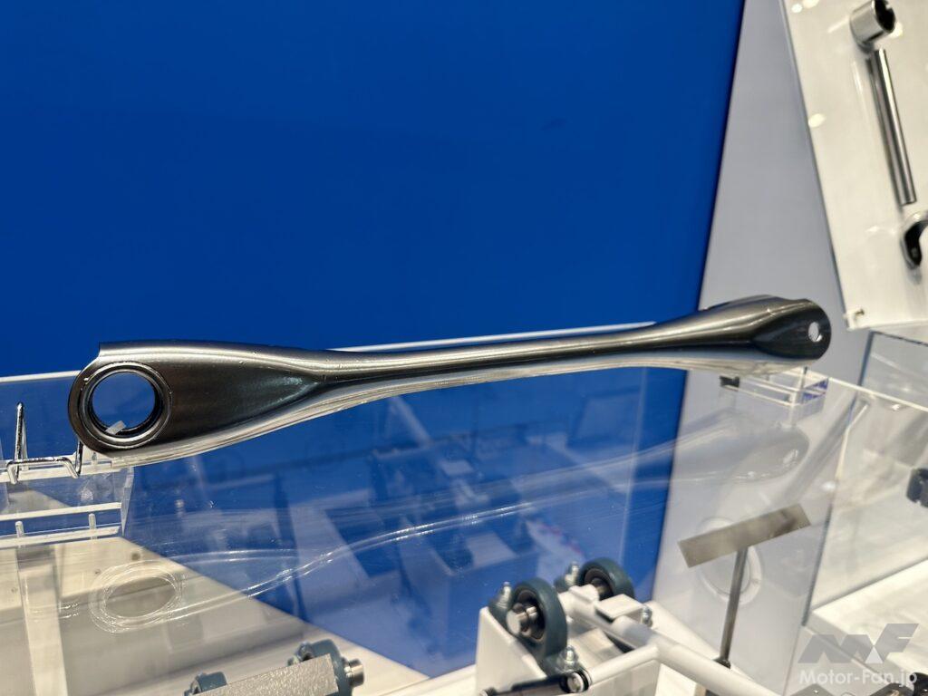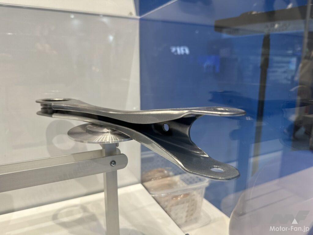 注目は超高張力鋼板(980MPa級)の製品化による軽量化だ。現状、590MPaの高張力鋼板を使った製品はすでに実用化している。ブースには、トヨタ・プリウスのリヤサスペンションリンクが展示されていた。