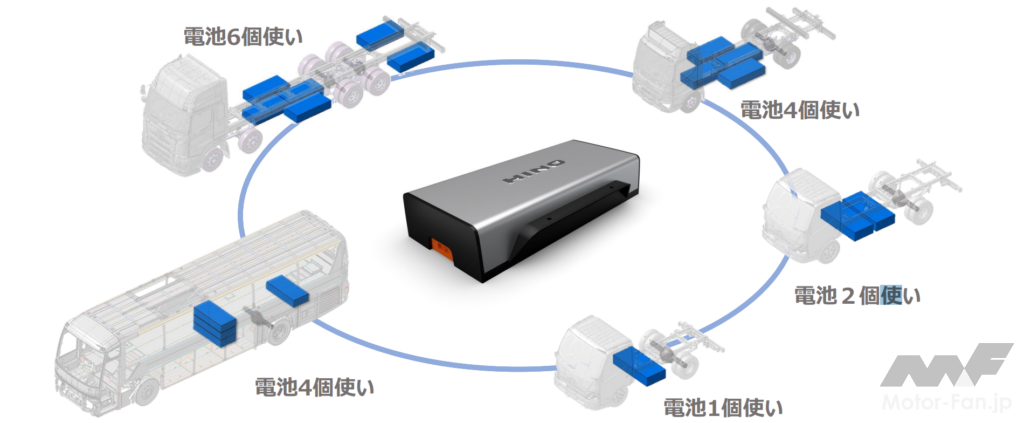 RE-BEVプラットフォーム構想における搭載電池パックは、様々な用途・車型の必要エネルギーにより標準化されているため、バッテリーセルの技術進化を制約することなく、普遍的な構造で汎用性を維持することができる。トレーラー、バス、小型・中型トラックなど、クルマの車格に合わせて電池の搭載個数を変更するなどして、設計を変えることなく普遍的に使いやすいモジュール構想となっている。